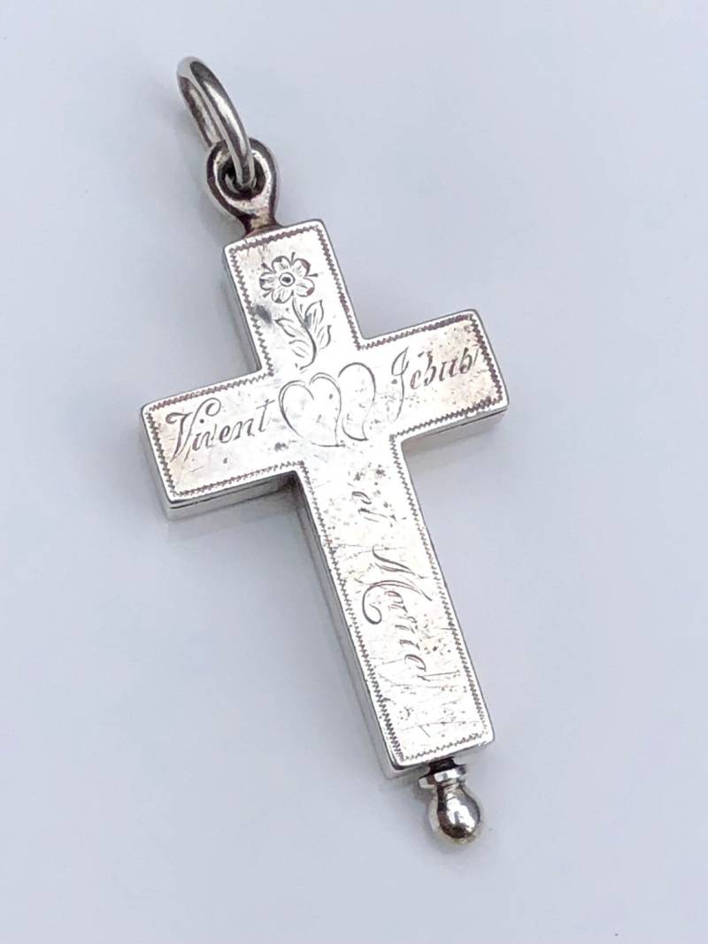 Ein Reliquienbrustkreuz aus Sterlingsilber von 1825 von Laurent Amiot. Dieses Stück wurde für eine der Nonnen am Hôpatial-Général de Québec angefertigt. Seltener und bedeutender schwerer Sterling Silber Reliquienschrein mit Klappdeckel. Hergestellt von Kanadas wichtigster Silberschmiede des 18. und frühen 19.Jahrhunderts. Der Zustand ist sehr gut mit einigen Gebrauchsspuren und Kratzern, aber ohne größere Dellen oder Dellen. -Die Abmessungen sind: 9,5 x 37 x 88 mm. Ungewöhnlich schwere Ausführung mit 56,1 Gramm. -Versteckte Scharniere. Reliquary entriegelt und öffnet sich, wenn die Rolle unten entfernt wird - Mit einfachen Blumen und Herzen graviert. Auch graviert mit den Botschaften: „Vivent Jesus et Marie" und „Marie a été conçue sans péché" -Gemarkt mit Serifen-Großbuchstaben für den Hersteller „L.A" in einer ovalen Kartusche. Da die Punze nach innen geschlagen wurde, ist ihr Zustand nahezu perfekt. Schauen Sie sich einige meiner anderen Sterling Silber hier 1825 Laurent Amiot Silber Reliquiar