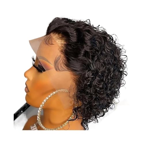 6 Zoll kurze lockige Echthaarperücken, Pixie-Schnitt, Bob, klebefreie Perücken vorne for Frauen, 13 x 1 Zoll Spitze, 180% Dichte Haar Extensions(Black)
