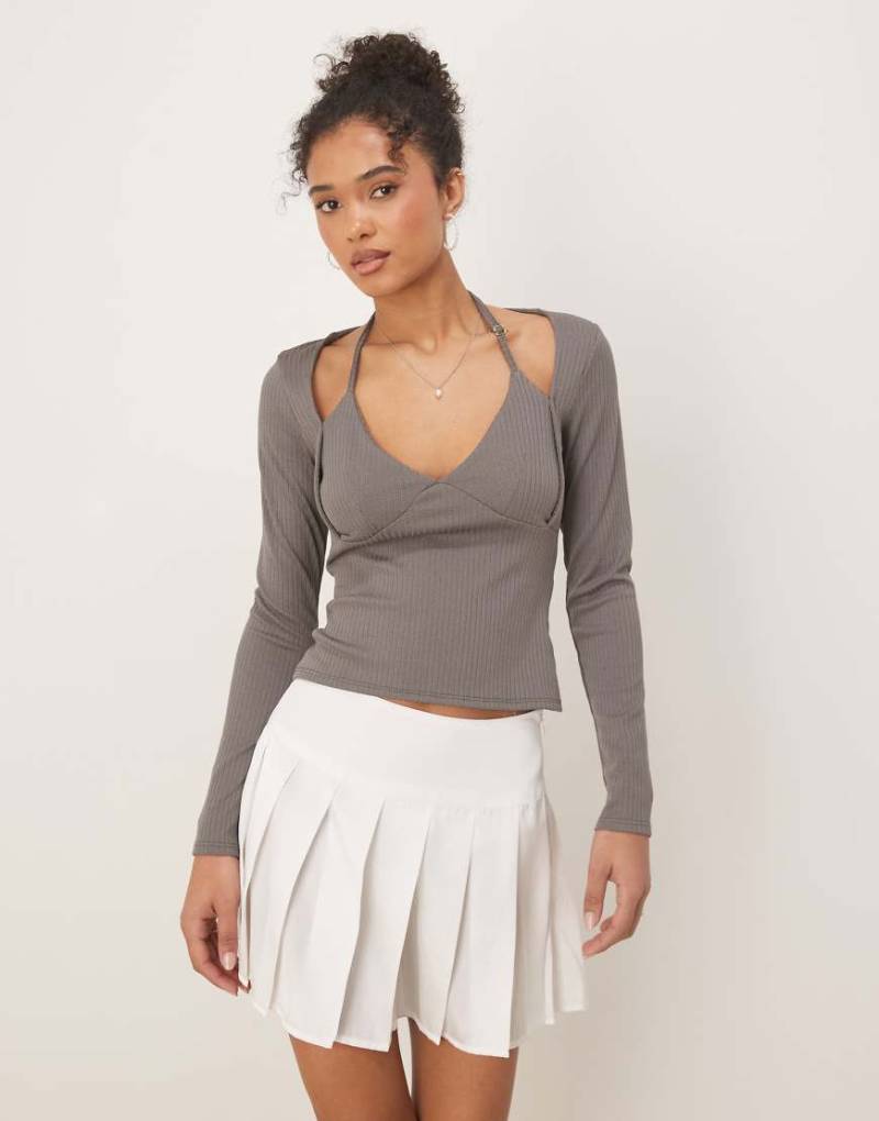 ASOS DESIGN - Langärmliges Oberteil in Grau mit Neckholder und Rippung