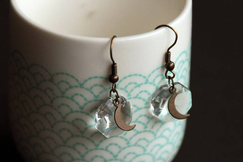 Paar Ohrringe bestehend aus kleinen Metallmonden und facettierten Swarovski-Kristallanhängern. Farbe: Messing Länge: 3,3 cm Die Lieferung erfolgt per einfachem Brief, ohne Versicherung. Zögern Sie nicht, mich zu kontaktieren, wenn Sie eine Sendungsverfolgung bevorzugen oder diesen Artikel in größeren Mengen wünschen. sternohrringe Nr. 3 Mond