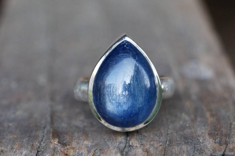 Disthen Tropfen Ring, Silber 925/-, Disthen Cabouchon glatt poliert 16x12mm, Ringweite 51, glänzend poliert und mattiert Toller Disthen Tropfen Ring in Silber 925/- . Eingefasst in einer glatten Zarge ist ein einnehmend schöner glatt polierter Disthen Cabouchon in Tropfenform von 16x12mm. Der Ring hat die Ringweite 51 und verfügt mit seiner 4mm breiten Ringschiene trotz der Größe des Steines über einen absolut angenehmen Tragekomfort. Ein wunderschönes Schmuckstück, eine traumhafte Komposition! Ganz wunderbar harmoniert die besondere und einzigartige Farbe des Disthen - blau changierend jeansblau - mit der mattierten Ringschiene und wird durch die glänzend polierte Fassung hervorgehoben - ein traumhaft schöner Ring mit einem ganz besonderen Stein! Werkstatt für Schmuckgestaltung Kerstin Schuppener, Hauptstraße 78, 66557 Illingen, Telefon: 06825 941905, | Außergewöhnlicher Ring Und Edelstein Disthen Tropfen Silber 925/ - Labradorit 16x12mm Ringweite 51 Glänzend Poliert/Mattiert