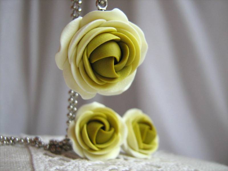 Fimo Schmuck-Set - Schattierungen Von Wasabi Grüne Rose Blumenanhänger Mit Edelstahl-Kugel-Kette Und Ohrstecker Ohrringe