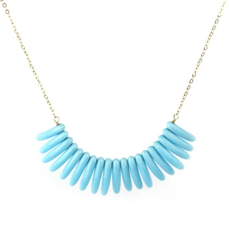 Einzigartige Halskette aus Vintage-Kristallperlen, die eine Bogenform auf dieser langen Halskette bilden. Diese Halskette ist sehr vielseitig und kann beidseitig getragen werden, die Kristalle können in beide Richtungen getragen werden. Eine Seite der Kristalle ist glatt und die andere Seite hat eine konkav geschnitzte Form. Hellblaue vintage Kristallsteine an einer vergoldeten Messingkette mit Karabinerverschluss. Toller vintage Blauton. Maße: Kettenlänge: 59cm Verlängerungskette: 3" Bogen aus Steinen: 6cm Steinlänge: 3/4" Handgemacht im Sarah Healy Design Studio Handgefertigt in den USA SOFORT LIEFERBAR Handgemachte Perlenfransen Halskette/Seltene Vintage Krallenförmige Perlenkette Einzigartiger Blauer Anhänger