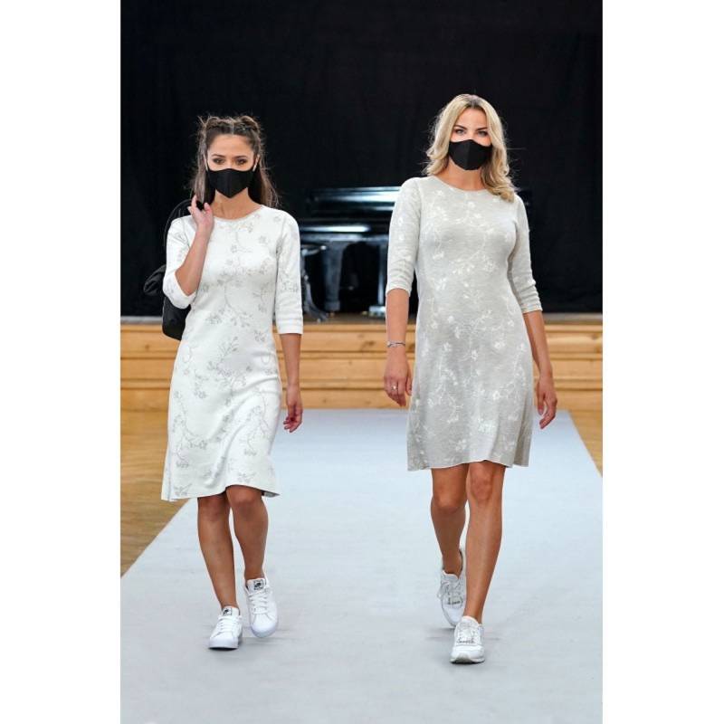 Doppelseitiges Kleid auf A mit Jacquardmuster /flowery Muster/. Von beiden Seiten zu tragen, so schafft es 2 farbige verschiedene Outfits Zusammensetzungen: 60% Baumwolle, 40% Acryl Waschbar bei 30o (Wollprogramm) Kleid 619/1