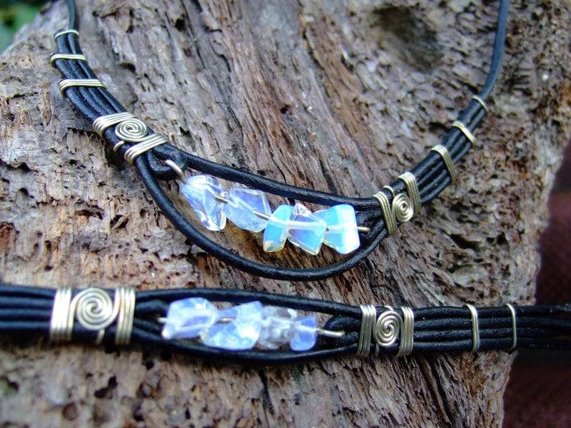handgefertigte - herrlich schimmernde -Lederhalskette, bestehend aus 4 untereinander gereihten, in der Länge gestuften, schwarzen Lederbändern, umwunden mit silberfarbigem Draht. in seiner Mitte hat die Halskette mehrere Mondsteine (Halbedelstein), die ebenfalls mit Draht in die Lederkette eingearbeitet worden sind. Der Verschluss besteht aus nickelfreiem, silberfarbigem Karabinerverschluss. Die Länge der Halskette liegt bei ca. 45 cm. Gerne verlängere oder kürze ich dir die Kette, so wie du es möchtest! (bei Verlängerungen je nach Länge kommt ein kleiner Aufpreis hinzu) Dazu gibt es das passende Armband, das ich dir ebenfalls in deiner Wunschlänge fertige. Lederhalskette "Mondstein 2010"