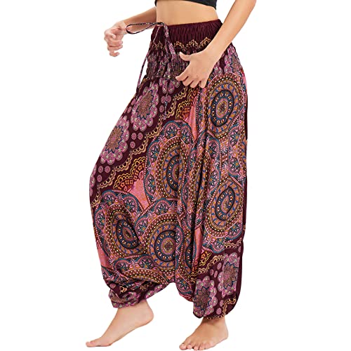 Nuofengkudu Damen Tiefer Schritt Hippie Haremshose Baggy Bunte Harem Jumpsuit Viskose Hose Leicht Dünn Luftig Wahrsagerin Kostüm Hosen Sommerhose Yogahose Haushose Einheitsgröße Blumen WeinRot