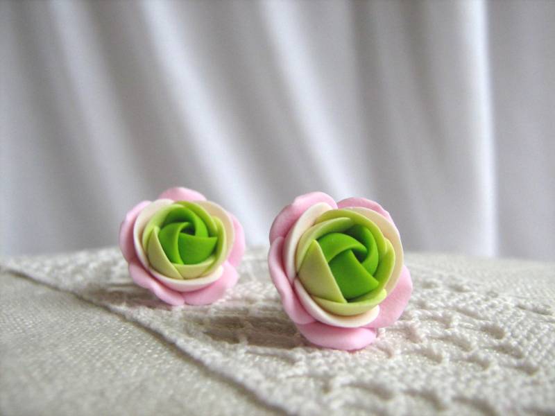 Ohrringe Aus Fimo - Licht Rosa Und Apfelgrün Rose Blume Ohrstecker Frühling