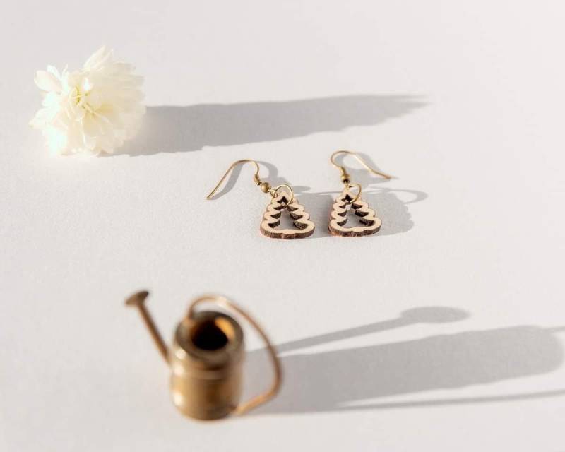 Verkaufe wunderschöne Ohrringe mit selbst entworfenen Anhängern aus Ahornholz. Der Tannenbaumanhänger kann naturbelassen, mit pflegendem Orangenöl behandelt oder handbemalt bestellt werden. Der dfx-file für den eigenen Laser kann für 5,-€ erworben werden. Ohrringe Tannenbaum