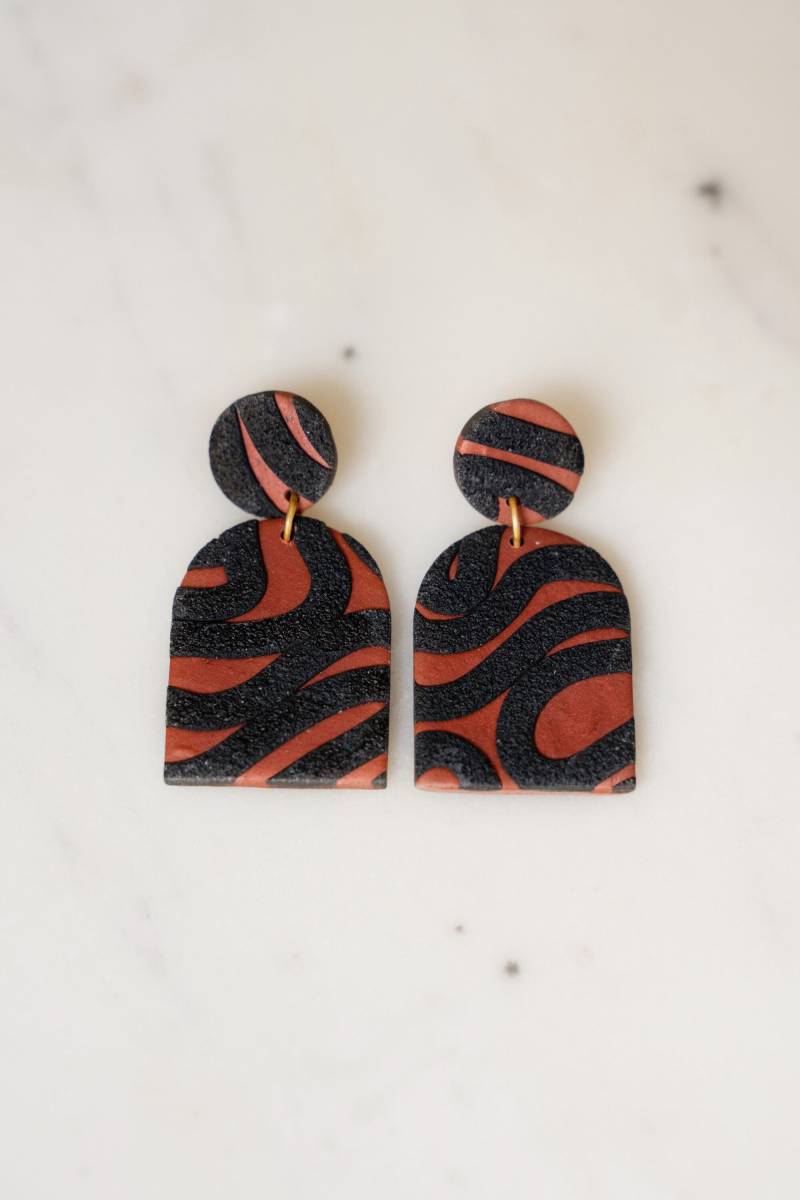 Polymer Clay Ohrringe | Unikat Geometrisch Statementohrringe Kupfer Orange Schwarz Muster Metallic