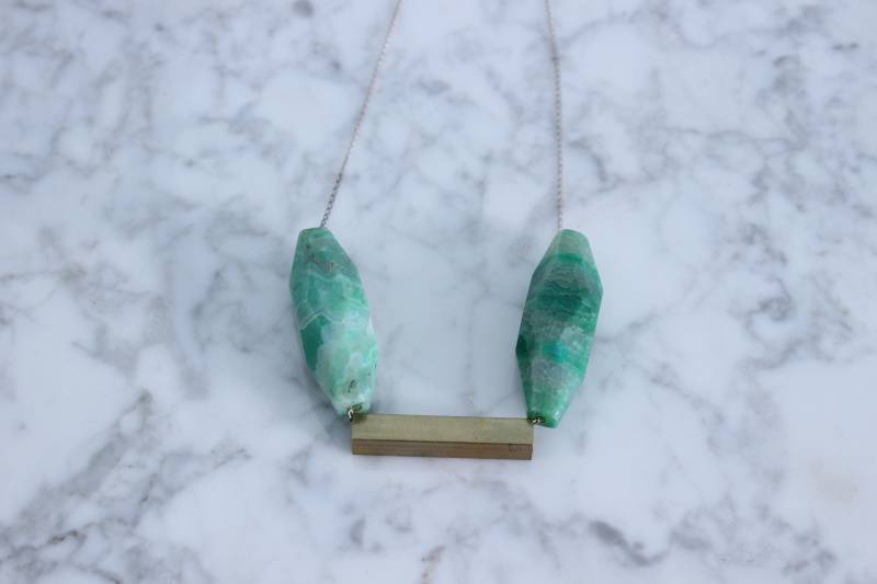 Zwei tiefe, leuchtende grüne Achat Steine, etwa auf beiden Seiten eines Rechtecks hellen Messing poliert. Sterling Silberkette ist 17,5". Handgefertigt in Brooklyn. Kommt verpackt in Brackwasser Kanal Geschenkverpackung. Tiefe Grüne Achatsteine Mit Messing Auf Sterling Silber Kette Halskette