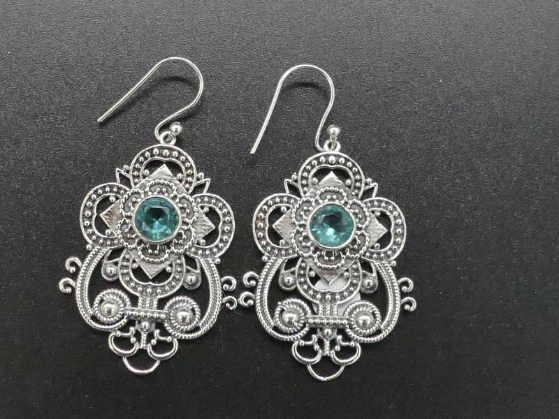 Wunderschöne 925 Silber Hängeohrringe mit kreisrundem blauem Topas. Der blaue Topas ist facettiert und schön schillernd. Er hat eine kreisrunde Form, Durchmesser ca.: 0,4 mm. Das Design des Hängeohrringes ist individuell gefertigt, der Stein handverlesen. Gesamtlänge des Ohrhängers ohne Ohrhaken ca.: 3,7 cm, Breite ca.: 2,7 cm. Ohrhaken ebenfalls aus 925 Silber. Topas steht für Macht und Erfolg, fördert das Selbstvertrauen. Er kann körperliche Anspannung lösen und emotional stabilisieren. Wunderschöne 925 Silber Hängeohrringe Mit Blauem Topas