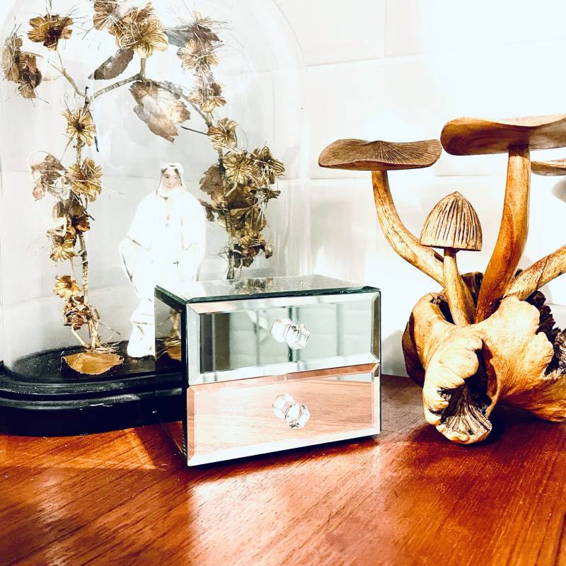 Zauberhafte Vintage Schuckschatulle, eine Mini Kommode mit zwei Schüben, perfekt zur Aufbewahrung von Kleinigkeiten im Bad, ob Schmuck, Kontaktlinsen oder Nagellack...das Schmuckdöschen ist komplett verspiegelt. Verkauf ohne Dekoration. Ca 12 x 9 x 9cm. Zauberhafte Vintage Schmuckschatulle Komplett Verspiegelt