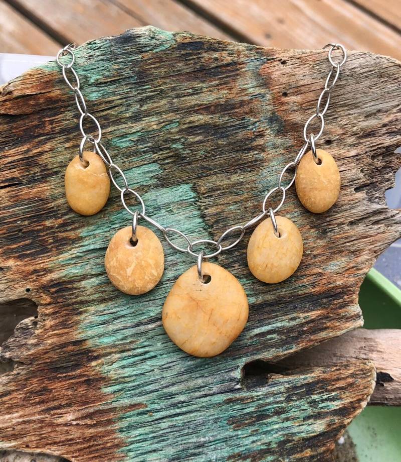 Diese Halskette besteht aus Strandsteinen, die ich an den Stränden von Kittery Maine bis nach Beals Island Maine handgepflückt habe. Die Steine sind an einer 45 cm langen Sterlingsilberkette.Alle Ösen sind verschweißt. strandsteinkette Mit Maine-strandsteinen